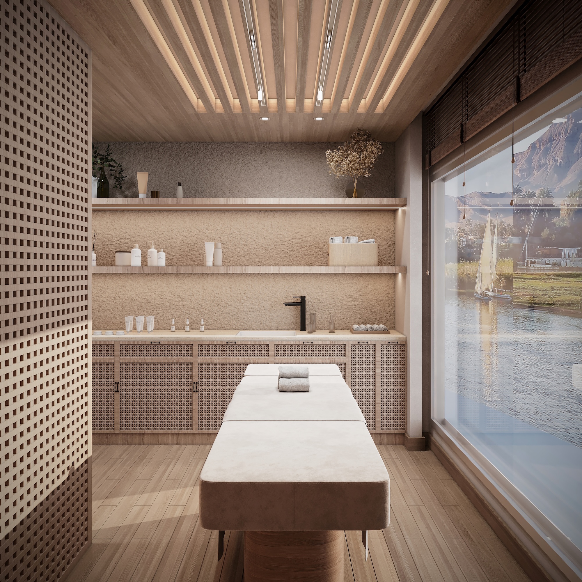 Perched on the highest deck, our lounge bar is an elegant sanctuary with floor-to-ceiling windows offering spectacular panoramic views of the Nile. This is the ideal venue for spirited celebrations or quiet relaxation while sailing, as our expert mixologists craft exquisite cocktails to elevate every moment. The bar’s statement design and decor are a harmonious blend of local culture and the surrounding environment, creating a truly unique and inviting atmosphere.