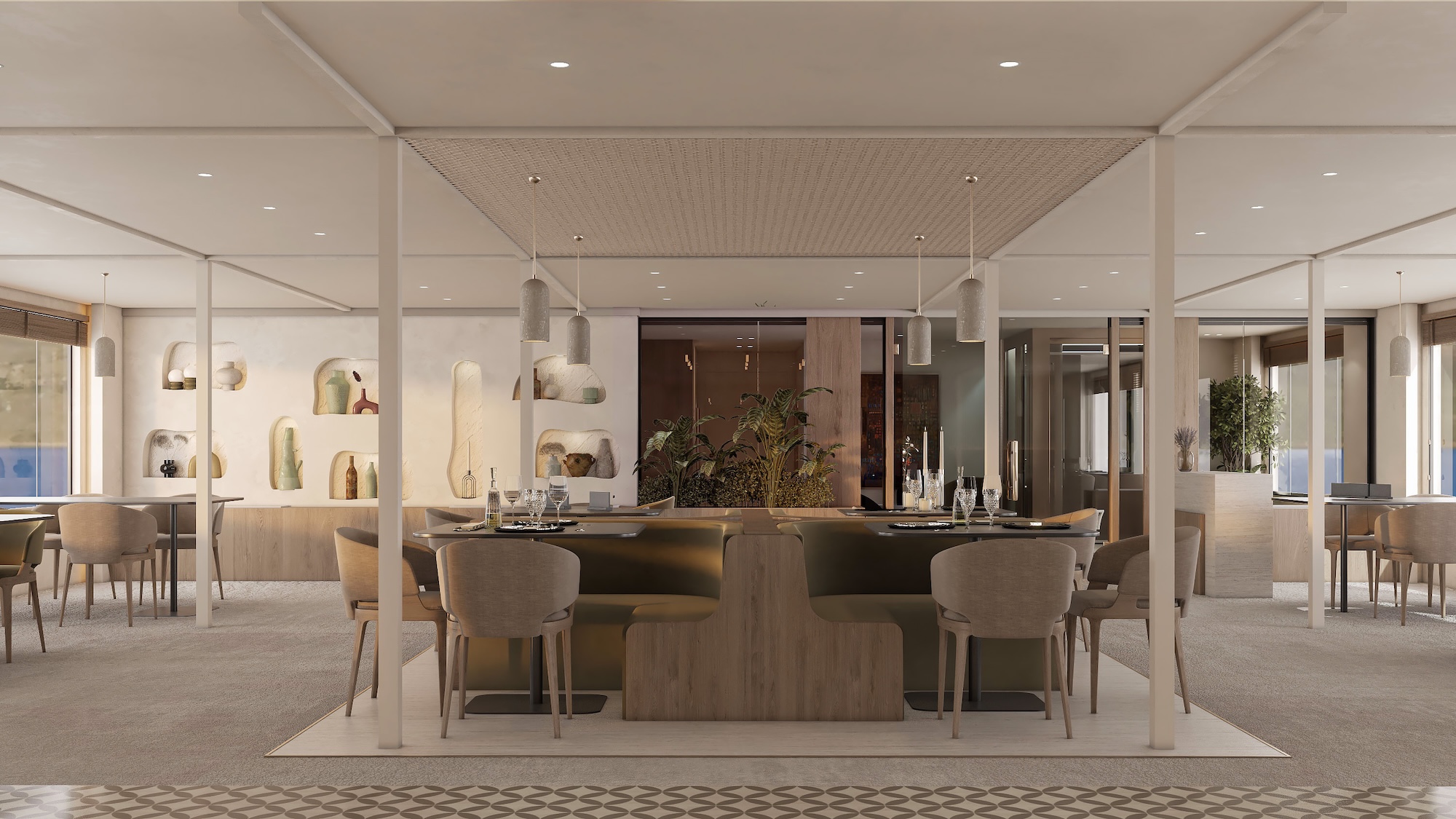 The Royal Suite, located on the Main Deck, offers the most expansive living space with a separate seating area and a distinct dressing area. The suite’s large panoramic windows provide a stunning backdrop, complemented by a decor that utilizes natural materials and a color palette mirroring the beauty of the surrounding landscape and drawing inspiration from the rich pharaonic culture.