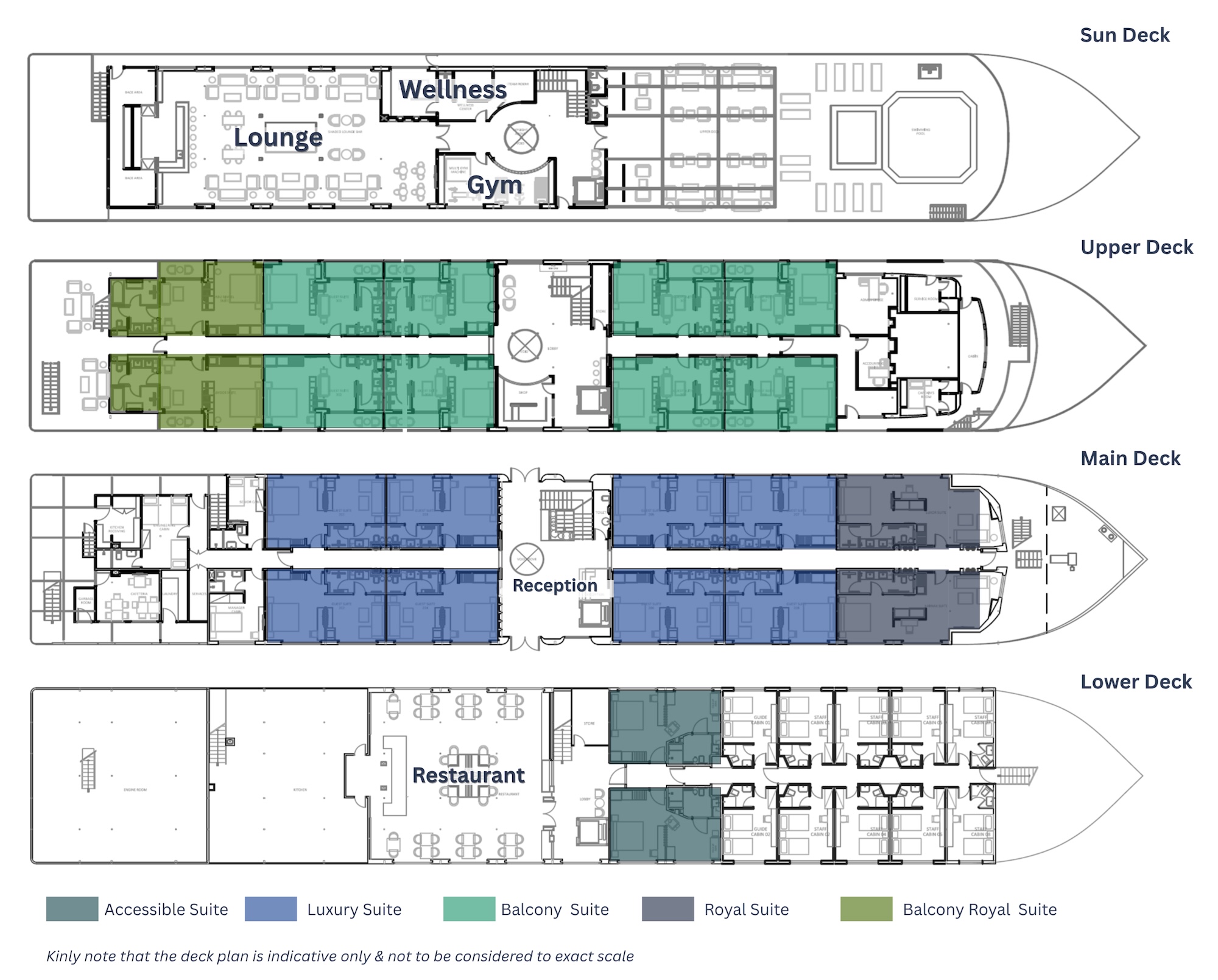 Recharge and refresh at our exclusive wellness center on the Upper Deck, designed to offer a sanctuary of calm during your cruise. The facility includes a private massage room, a soothing steam room and sauna, and a modern gym for guests to use at their leisure. It is the perfect place to balance exploration with relaxation, ensuring a truly revitalizing and memorable experience.